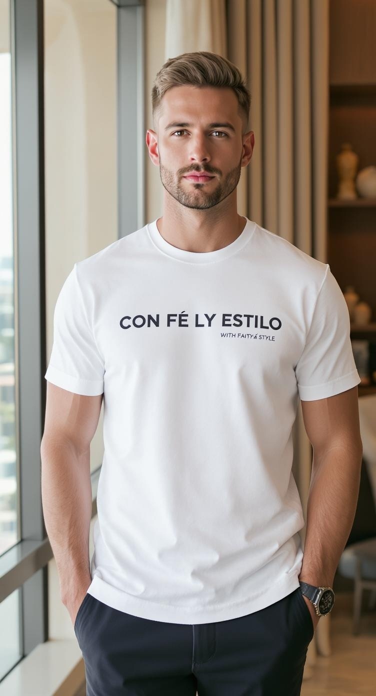 A clean, classic white tee with a bold message – “Con Fé Y Estilo / With Faith and Style.” This versatile shirt is a wardrobe essential that can be dressed up or down. Whether you’re pairing it with skirts, denim, or layering it with a jacket, this t-shirt is all about effortless style. The soft fabric ensures lasting comfort, while the simple yet empowering message adds a personal touch to your casual outfits.